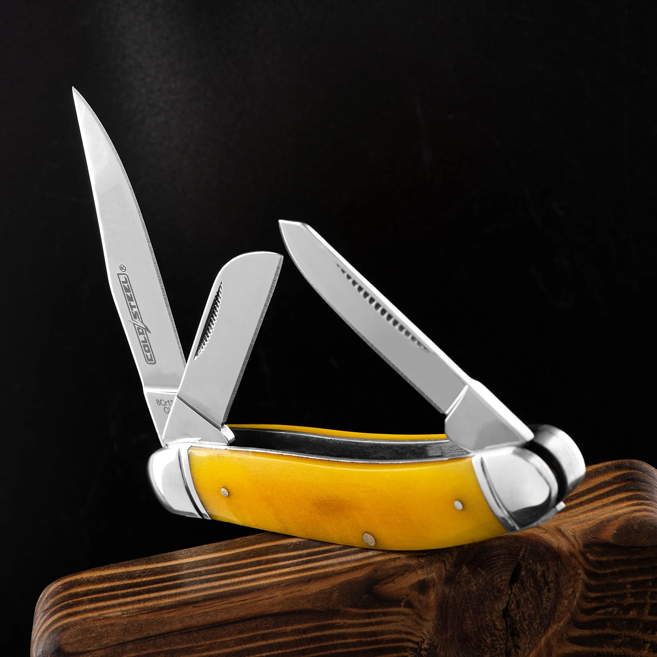 The Cold Steel Gentleman’s Stockman Folding Knife with three blades, which has been customarily called a Stockman knife, has the standard clip point and spey point blade of the Trapper with the addition of a sheep’s foot styled blade.