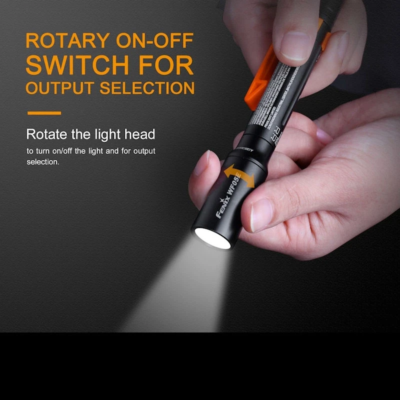 WF05E is powered by 2 x AAA alkaline batteries (included) and operated by a twist head switch which turns the flashlight on / off and cycles between 3 power levels of 30 and 85 and 10 lumens. A detachable anti-static clip allows for convenient pocket carry. The flashlight weighs only 38 grams excluding batteries and is waterproof to 2 metres depth.