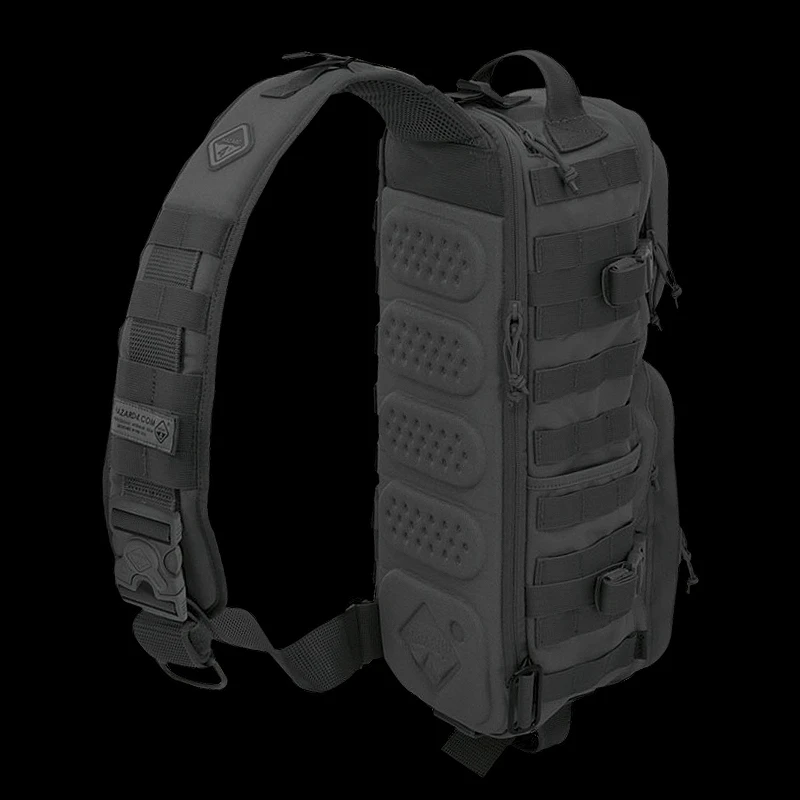 This is the environment for which The Hazard4 Evac Plan-B ’17 sling-pack has been developed. Slim shaped, for fast maneuvering in crowds, they can be stored in vehicles/lockers, and are quick to take on or off. They are also ambidextrous, and unlike others in this class, are actually comfortable to wear. The main padded strap is cocked at either the right or left lower corner, so the pad aligns ergonomically in the correct body-hugging direction. There is no slack, or gapping away from the body as is typical with similar single shoulder packs.