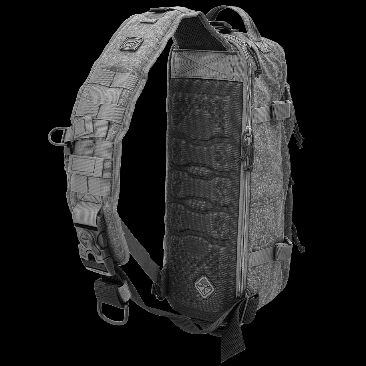 Slim shaped, for fast maneuvering in crowds, the Hazard 4 Plan B Greyman can be stored in vehicles/lockers, and are quick to take on or off. They are also ambidextrous, and unlike others in this class, are actually comfortable to wear. The main padded strap is cocked at either the right or left lower corner, so the pad aligns ergonomically in the correct body-hugging direction. There is no slack, or gapping away from the body as is typical with similar single shoulder packs. The bag can be rotated to the chest for on-the-go access, and all pockets are designed to face the user in this mode on either the right or left side. This means the user can go from wearing the pack on his back, to driving a vehicle with it on his chest in just a few seconds. One-strap also makes shouldering a long-gun natural – unlike a regular backpack.