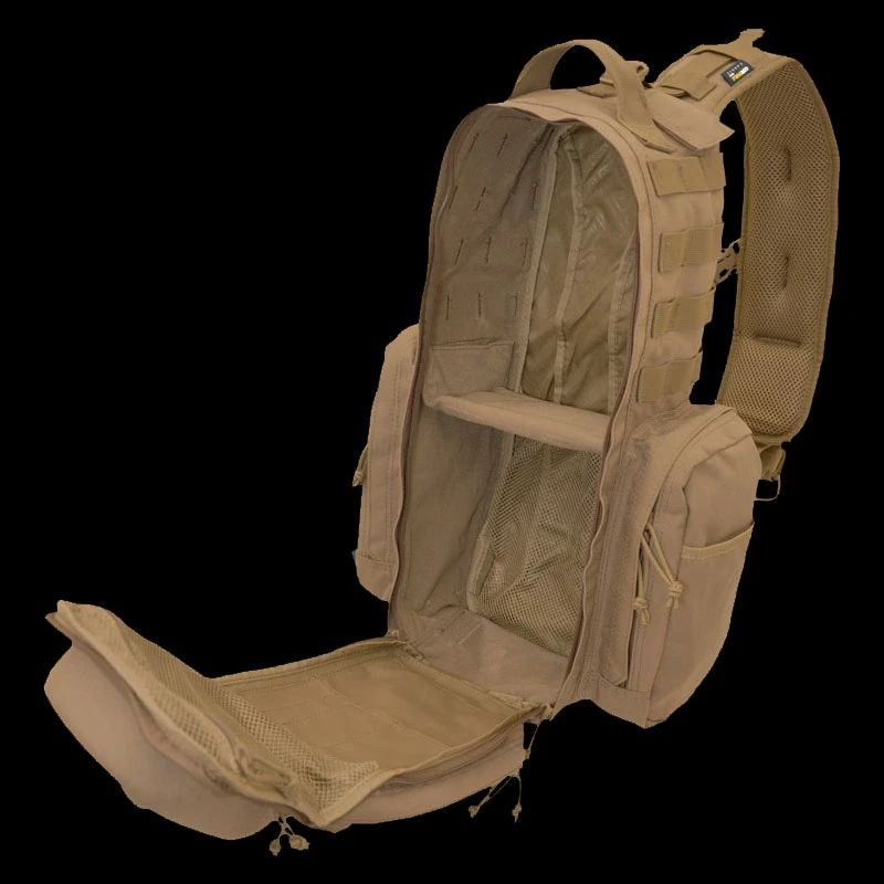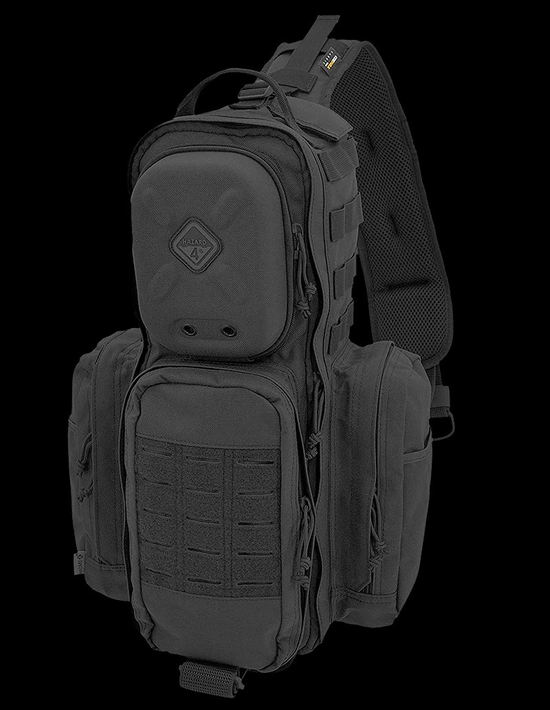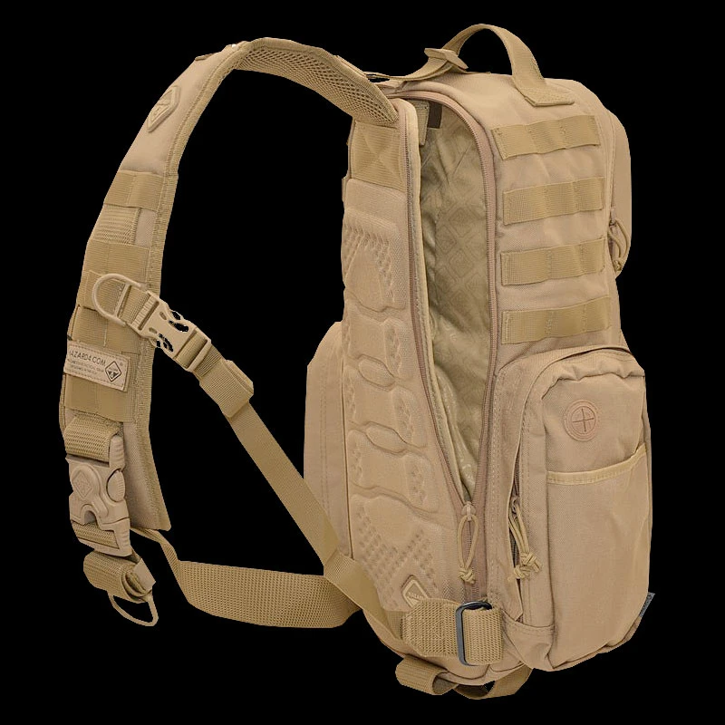Being jammed in confined spaces for hours is an unfortunate part of the business for many professionals. Whether it’s a military unit in an a.p.c., a pilot in a cockpit, drivers in a HumVee, or a journalist in the back of a goat truck, they all have to bring their gear. And they all may need to ‘relocate’ in a hurry. This is the environment for which the Hazard4 Evac line of sling packs has been geared. They are slim shaped to be easily manoeuvred in crowds, or stored in vehicles/lockers, and are quick to take on or off. They are also ambidextrous, and unlike others in this class, are actually comfortable on the shoulder; The bottom strap clips from either the right or left lower corner and the padded section realigns itself ergonomically in the correct body-hugging direction. The bag can be rotated to the chest for on-the-go access, and all pockets are designed to face the user in this mode on either the right or left side. One-strap-carry also makes shouldering a long-gun comfortable – unlike a backpack.