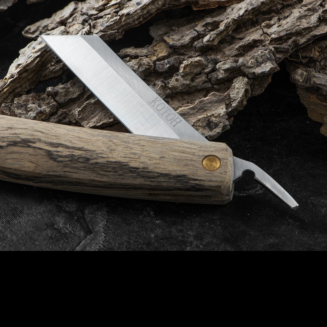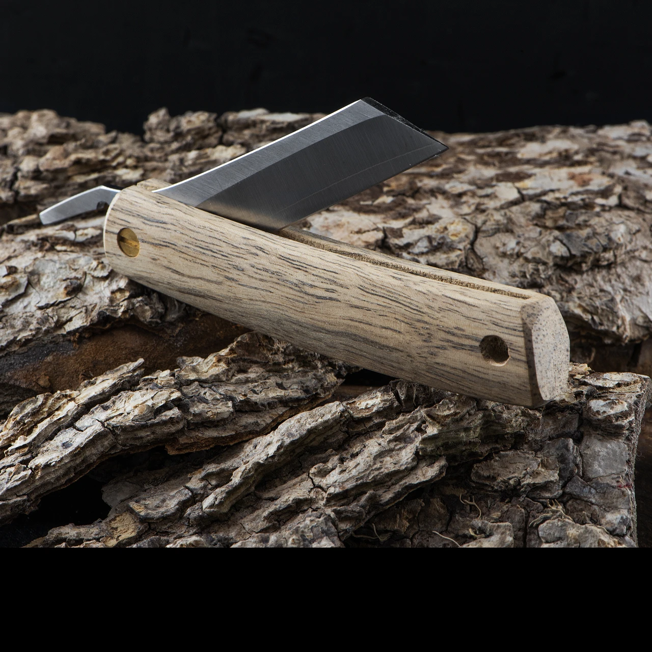 The handle is simply one piece of Black Persimmon wood with the mid section precisely cut out to accommodate the blade. The blade is made from tough, hard carbon steel and has an extended tang to aid one handed opening and to prevent closing during use.