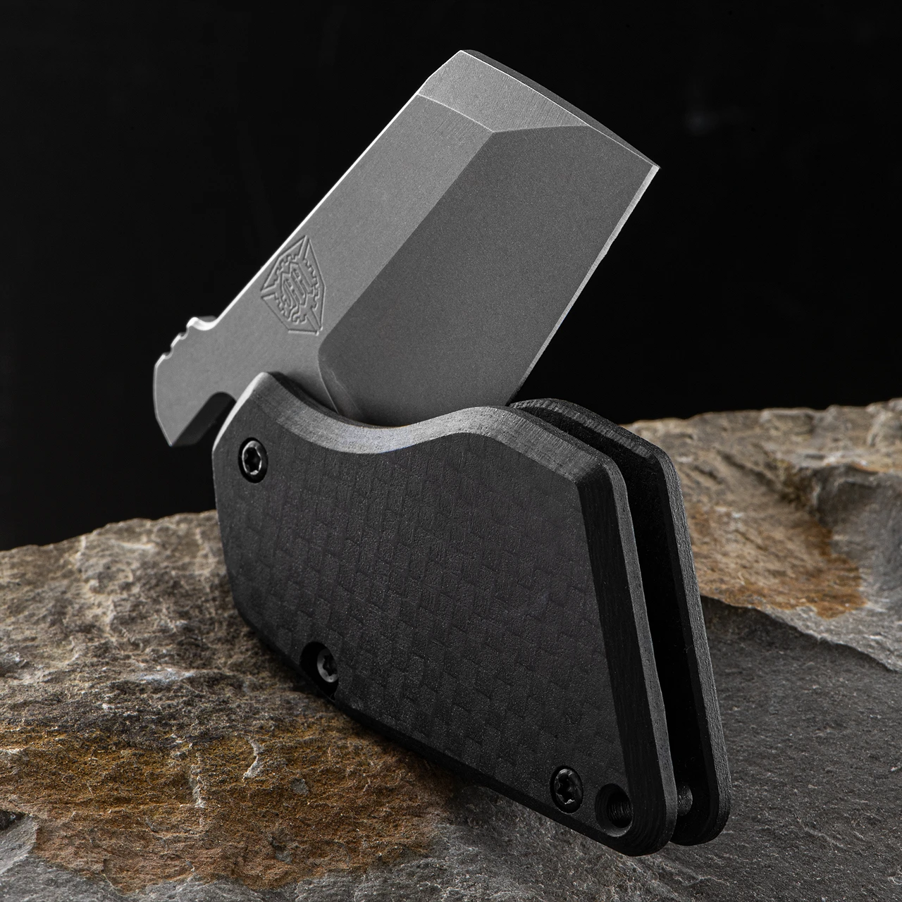 This model has a 1.75″ long CPM 154 chisel ground blade with matte carbon fibre handle and features