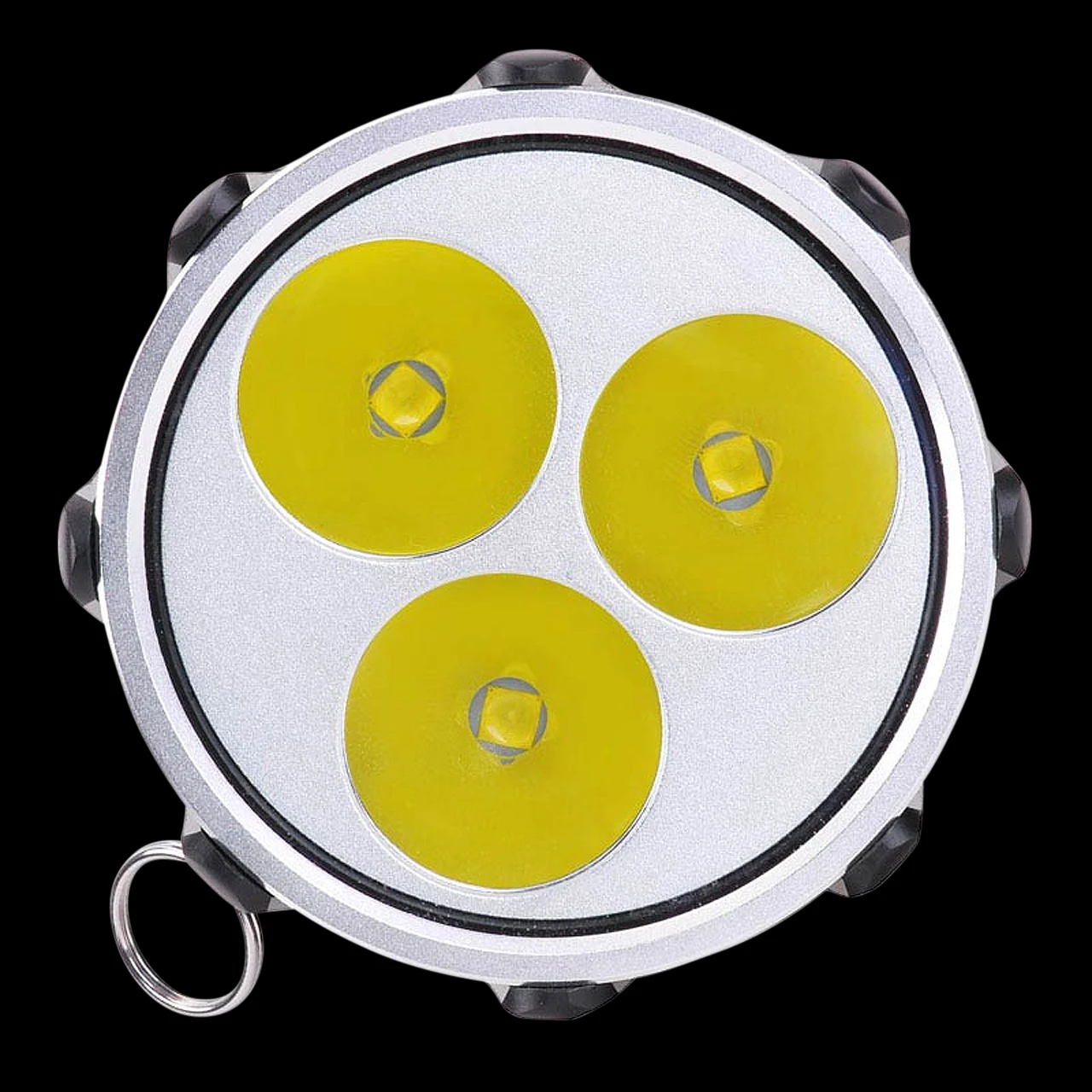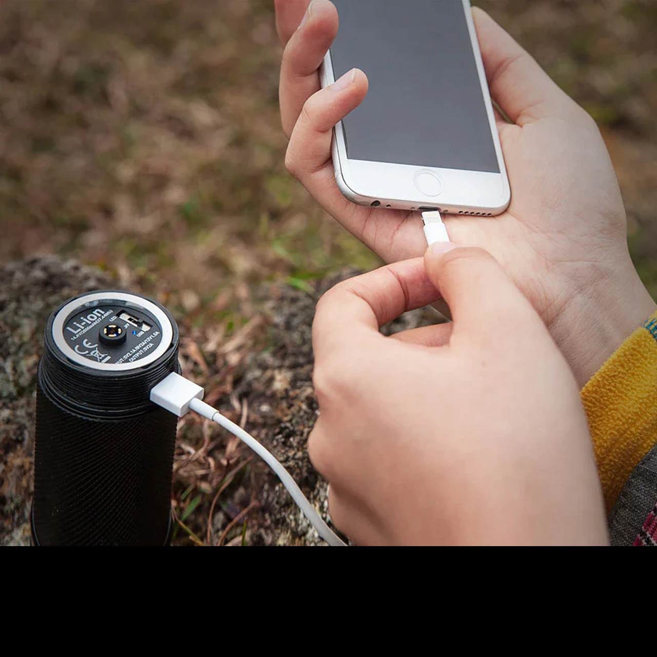The battery of the NEXTORCH Saint Torch 30 makes up the bottom part of the handle of this torch, and can also be used as a standalone power bank. A USB-C connection is integrated in the battery for this purpose. Four blue LEDs integrated in the side provide information about the current charging status. Each time you turn it on or change mode, these LEDs reliably show the current status.