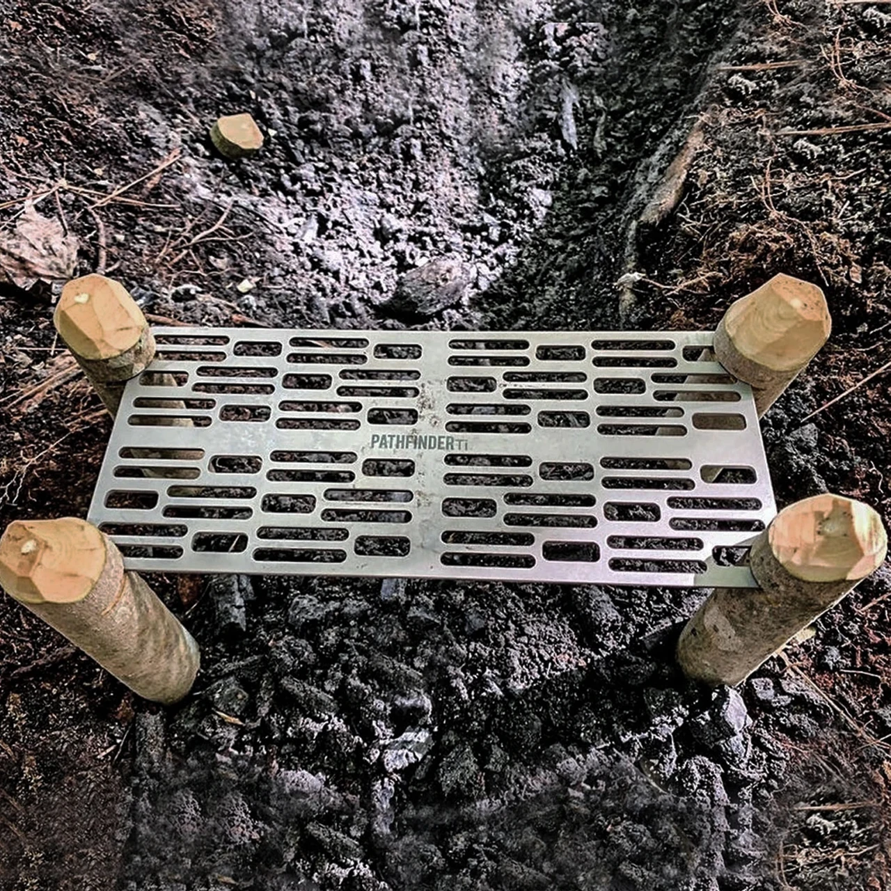 The Pathfinder Titanium Grill offers a robust cooking surface at a convenient to carry size and weight, along with a pouch to protect your grill from your gear and your gear from your grill.