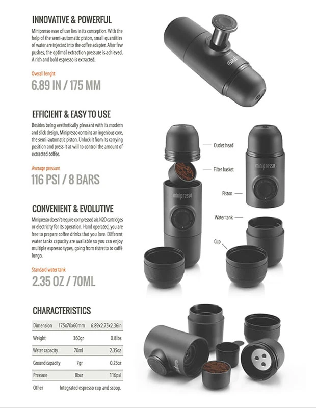 Minipresso GR is the perfect portable espresso machine. Compact, lightweight and versatile, you are free to use any coffee beans, which will give you more flexibility in trying new flavors. Grind at your convenience, you have more control over the preparation which will translate into being able of achieving perfect espresso shots that will please even the most perfectionist coffee lover.